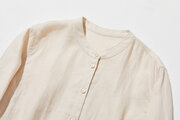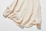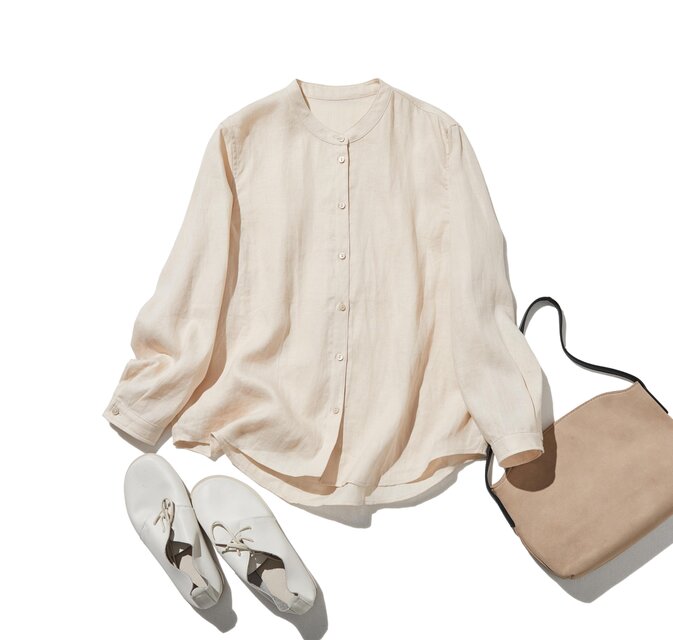 フランスリネンの上質さと、バンドカラーがもたらすきちんと感。そして、ラウンドカット裾の抜け感が絶妙にバランス。