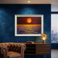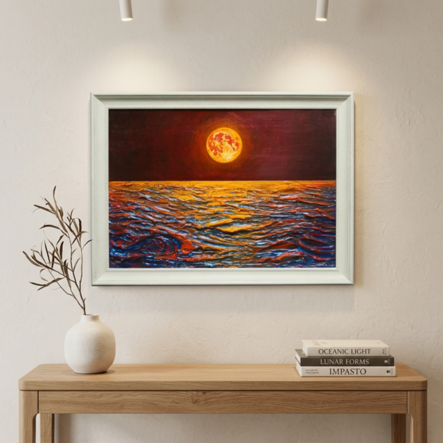 濃厚なオレンジと深いブルー、そして反射するゴールドのコントラストは、風水において「繁栄」と「金運」を象徴します。満月がもたらす満たされたエネルギーを、目に見える形で取り込むことができます。この作品を通じて、空間に福を招き入れる特別な存在を感じてください。