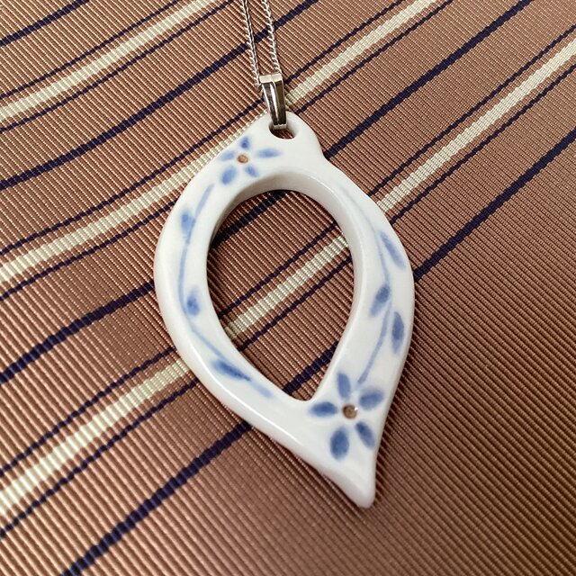 磁土で成形して、楕円の中に小さなお花を彫り、素焼き後、呉須を入れ、本焼きしています。