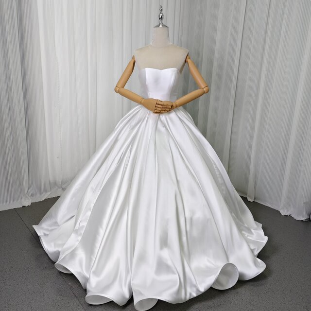 ウェディングドレス ベアトップ ミカドサテン ラッフルフリル 豪華なバックリボン 編み上げ 結婚式