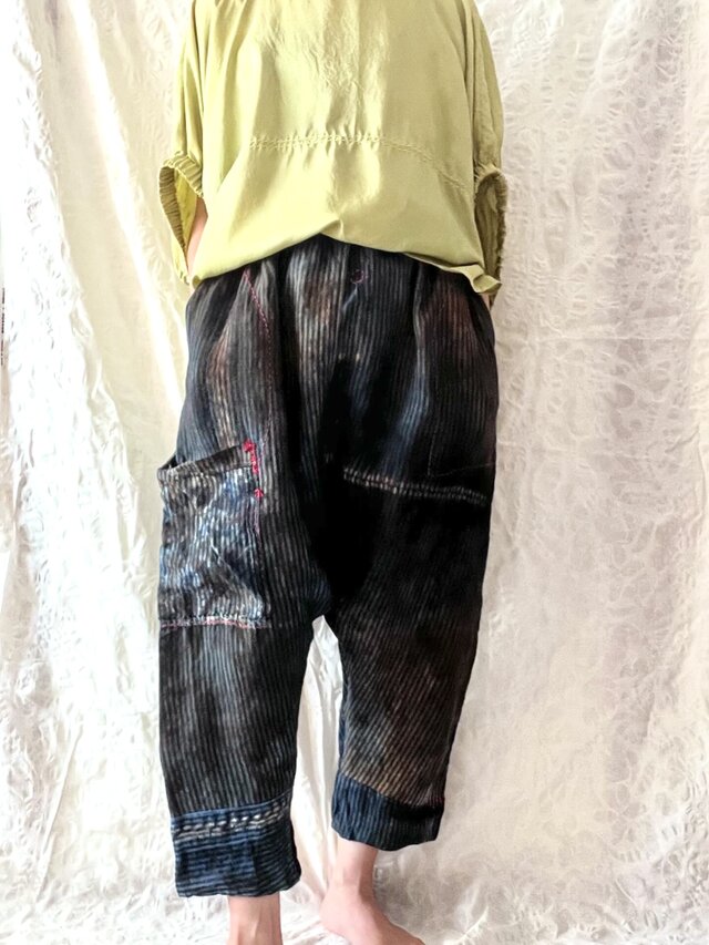 リネン100%の素材を藍の絞り染めと柿渋で 染め上げています。