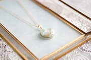 ホワイトとグリーンのマーブル模様のレジンに白とブラウンでラインを引いた、天然石風の模様が独特のニュアンスを生んでいるペンダント。