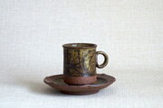 この作品は、信楽の土を用いろくろで成形して、幾何模様は鉄釉で描いています。鉄釉には、近くの川から採取した原料をもとに独自に調合したものを用いています。温かみのある色合いの中に、リズミカルな模様が映え、豊かな表情を生み出しています。なめらかな口当たりで飲みやすいカップです。ソーサーは縁を花形に仕上げています。それぞれ単品でもお使いいただけます。