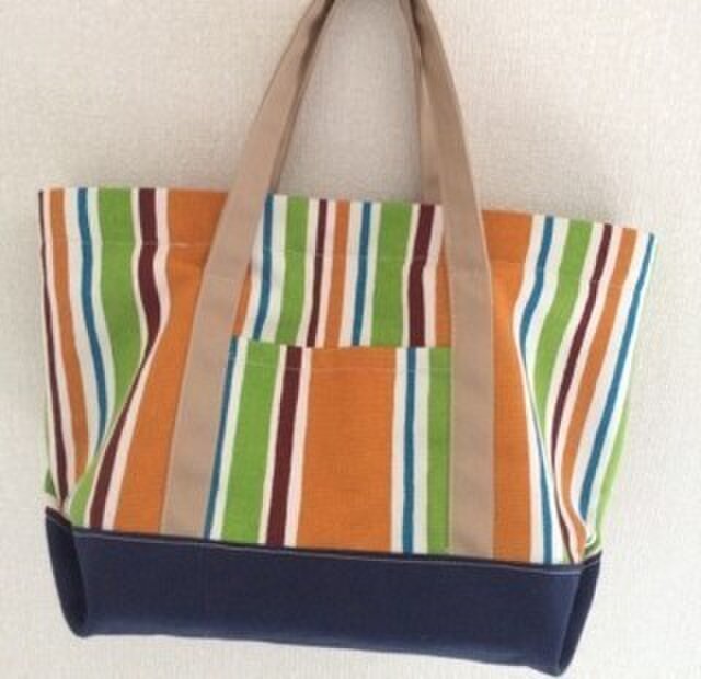 オレンジストライプの帆布で、少し小さめのお散歩トートを作りました。ちょっとそこまでのお買いもの、これからの季節のお散歩に最適です。
