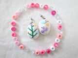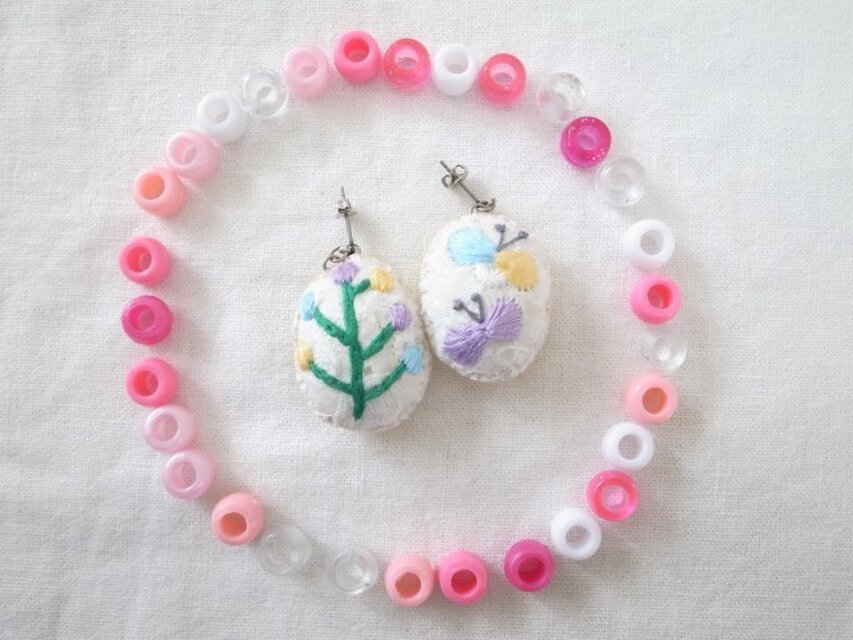 材料:綿のハギレ布・フェルト・わた・刺繍糸・ピアスの金具