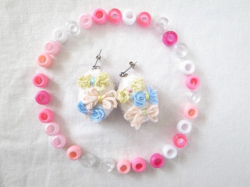 材料:綿のハギレ布・フェルト・わた・刺繍糸・ピアスの金具・AVRILの糸