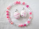 ぷっくりしたしましまとみずたまが両耳でゆらゆらゆれるピアスです。