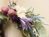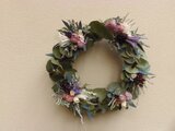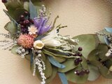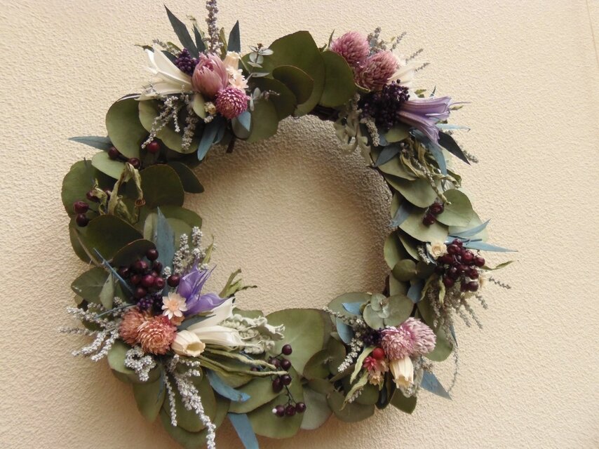 花材:ドライユーカリ、プリザーブドユーカリ、ソフトストーベ、ニゲラオリエンタリス、 千日紅、千日紅の葉、シルバーデージー、ペッパーベリー、ライスフラワー、
