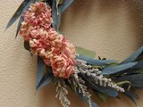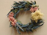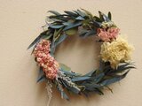 花材: ユーカリ、オリーブ、千日紅の葉、プリザーブドユーカリ(ブルー)