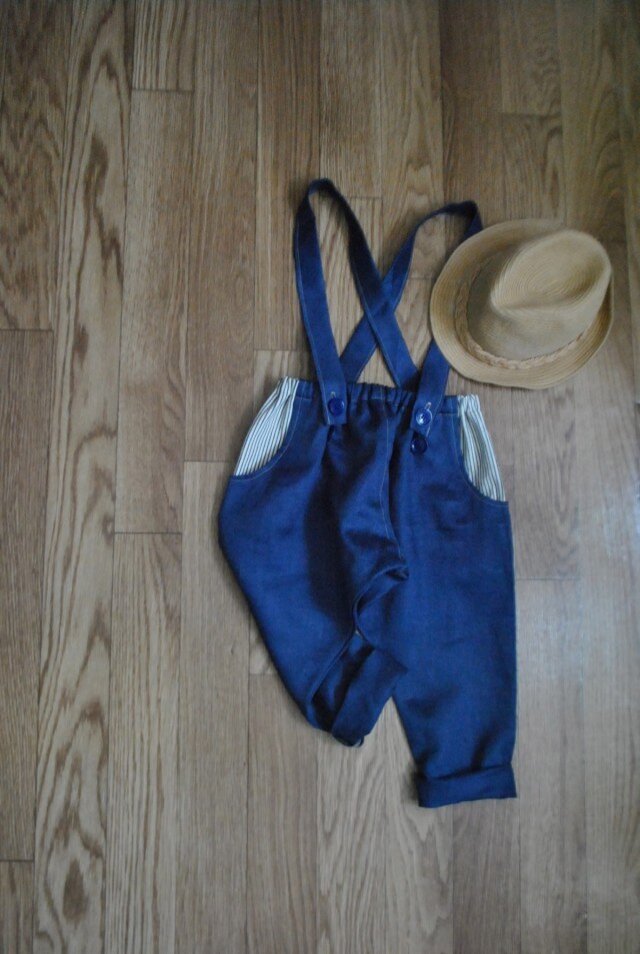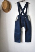 ジーンズに似たネイビーの吊り紐が付いたパンツです。