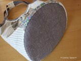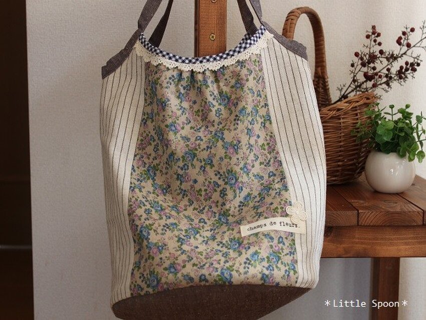楕円型の底マチと、持ち手には、ブラウンのダンガリーを使用しています。