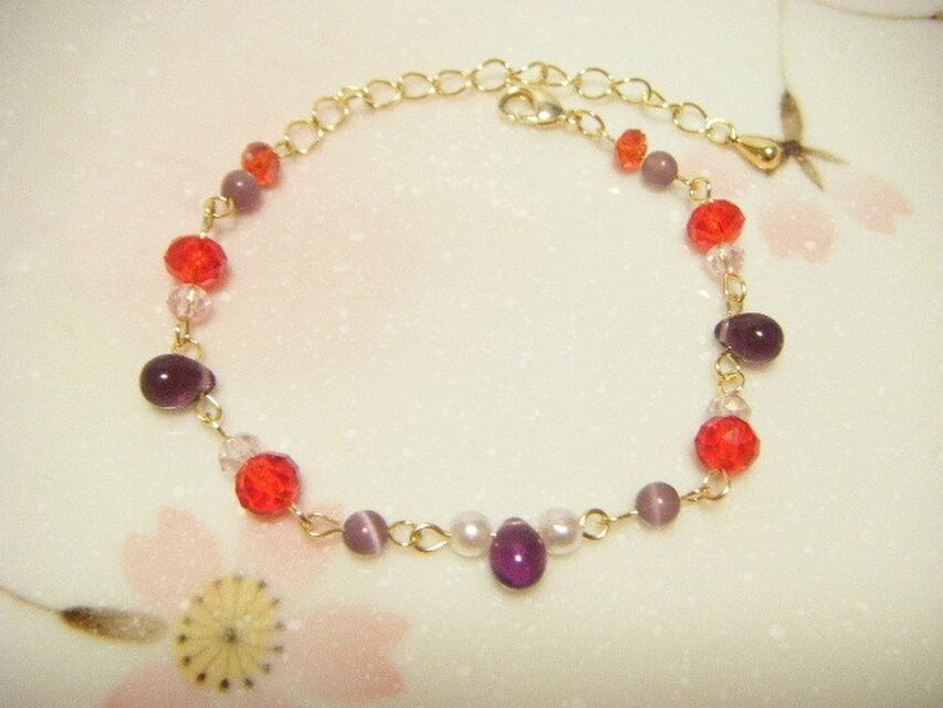 レッド&ライトピンク色ガラスビーズのキラキラとした美しさとパープル色キャッツアイの不思議な光沢感がとっても素敵な作品に仕上げました♪
