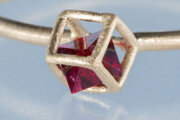 スピネルの赤い原石がボックスの中で優しく揺れて輝きます。
