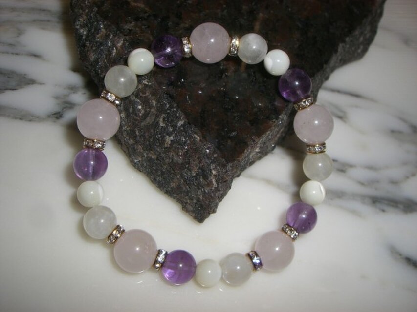 こちらはローズクォーツ(10φ)+アメジスト(8φ)+ムーンストーン(8φ)+マザーオブパール(6φ)+ロンデル(ゴールド色)を組み合わせたパワーストーンファッションブレスになります。