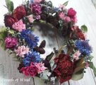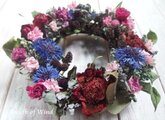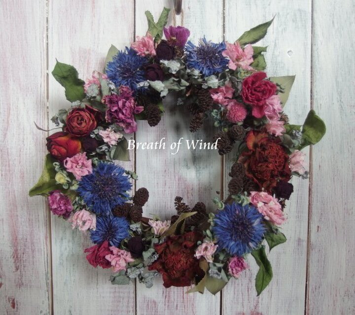 ツバキと青い矢車草のリース