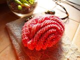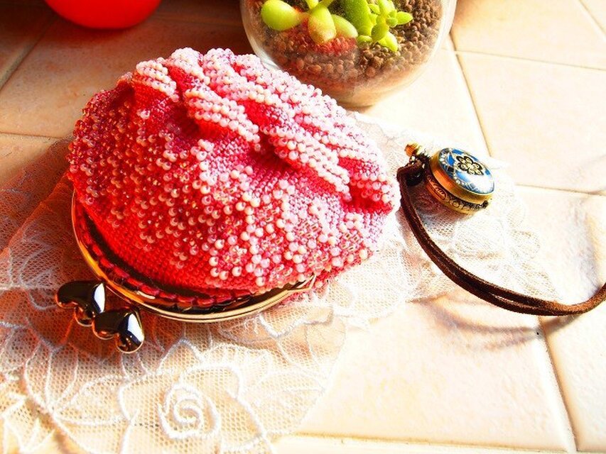 本当に小さいビーズで作られているのですね、お写真はビーズが大きく映っていましたので、手に取って観て驚きました。素敵です。内側にも丁寧に布が張られていてリップなど入れても大丈夫かしら、と思いました。大切に使わせて頂きます。オマケノ品もありがとうございました。早速利用しております。