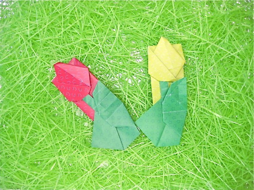 それぞれ、1枚の正方形を切らないで折りだしています。