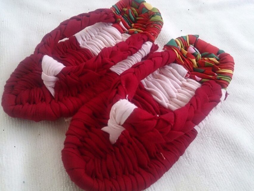 赤とピンクをベースに、かかと部分にハワイアン柄の生地を使って編んだ布ぞうりです。