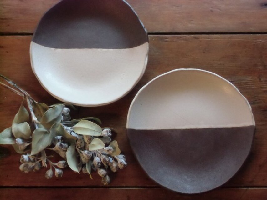 白マット釉とオリジナル鉄マット釉を掛け分けた陶の丸皿です。