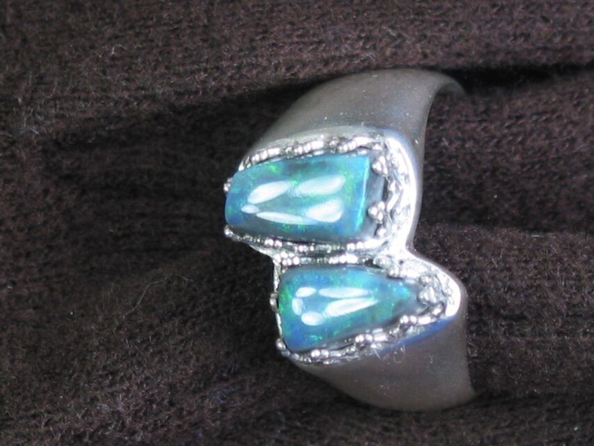 オーストラリア・ライトニングリッジ産のブラックオパールのリングです。グリーン~ブルーの遊色が美しいです。小ぶりな石ですが、2つ合わせて、他にはない形のリングで、とても華やかです。リングのサイズは16号、最大幅は14mm、重さは7g、金属部分は純銀製です。