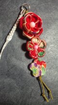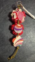 パッと目を引く、華やかな赤いつまみ細工のストラップです。