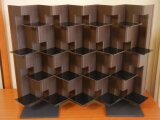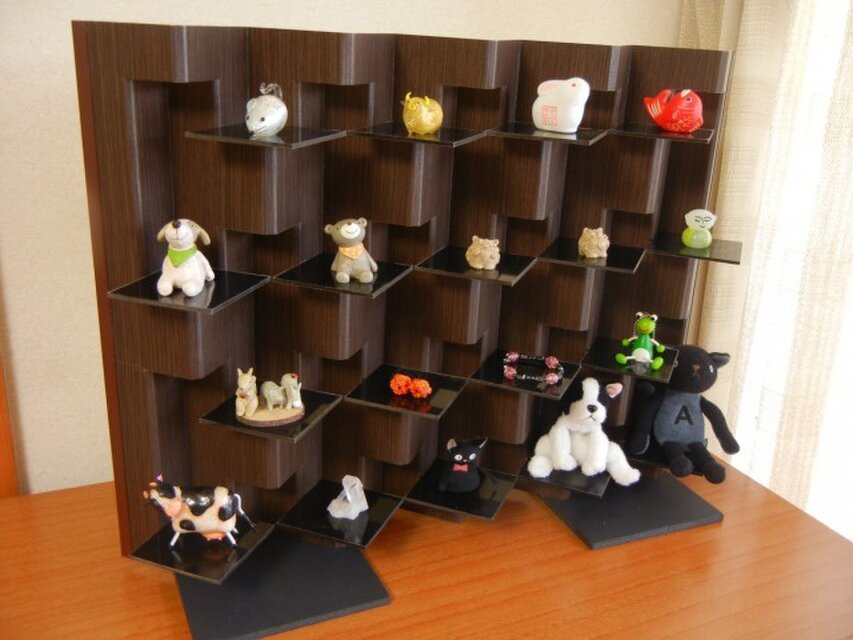 出品は、パンタパネルミニ フルサイズ(高さ42㎝)と、据え置き用の簡易スタンドと、セルテーブル18枚をセットしたモデルです。陳列品を、一点ずつ際立たせてディスプレイできる飾り棚で、8㎝角の小さなテーブルがステージになり、視線を集めるスポットになります。 8㎝角のセルテーブルは、前面からワンタッチで着脱でき、雑貨小物品やフィギュアなどをクールにディスプレイできます。