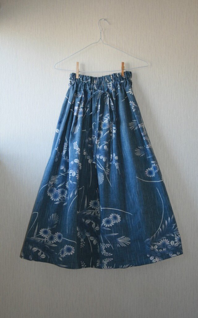 夏らしい秋草柄のスカートです。ダンガリーの様な発色の青がさわやかな印象です。