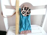 珍しいしぼりムラ染めのワイルドな感じの1枚革を裏側をスポンジ素材の柔らかい布に合わせて豹柄フラップを付けたボディバッグです。