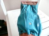 写真でも質感が伝わるかと思いますが、青色の革を縦にしわを付けたままプリーツ状にプレスして染めた牛革です。使用に支障は有りませんが、全面下方部に小さな3ミリくらいの穴が開いています。