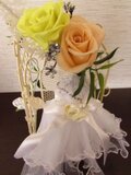大輪のプリザーブドローズはパステルサーモンピンクとパステルイエロー。周りにシルバーやホワイトのリーフピック、レースでスィートな雰囲気を演出しました☆彡