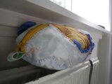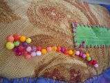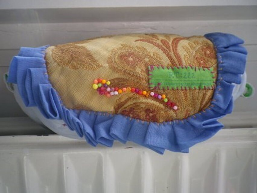 古いカーテンの生地とビーズ、フリルでユニークに仕上げました。