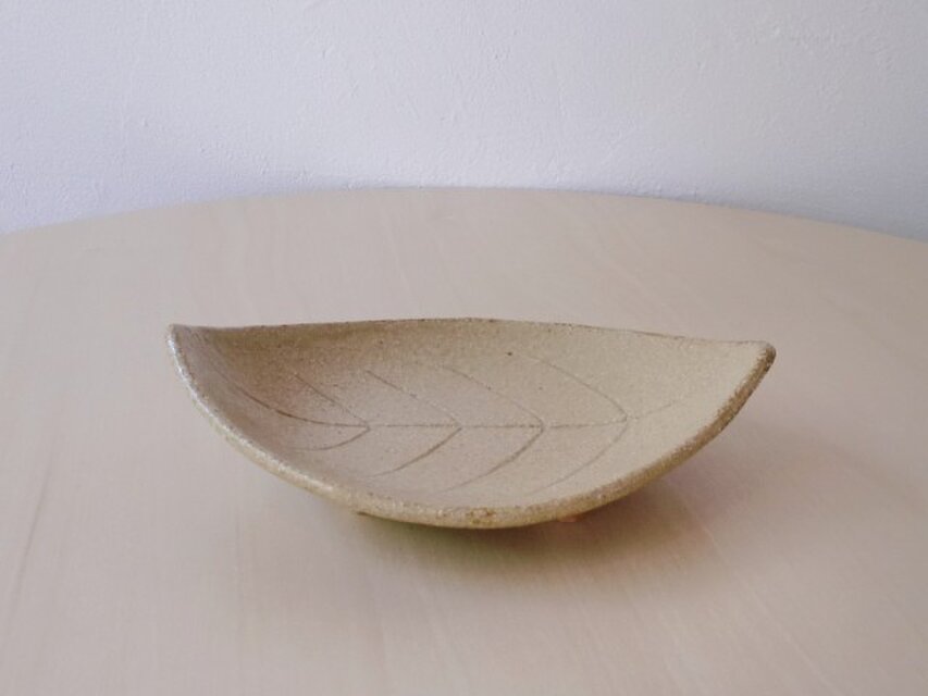うすい茶色の木の葉形の足つきタタラ皿です。