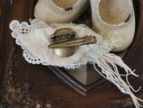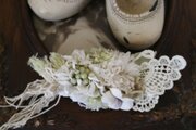 オフホワイトのガクアジサイやオーガンジーのデージー、すみれなどとレースの蝶でクリップ付きのコサージュに仕立てました。