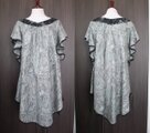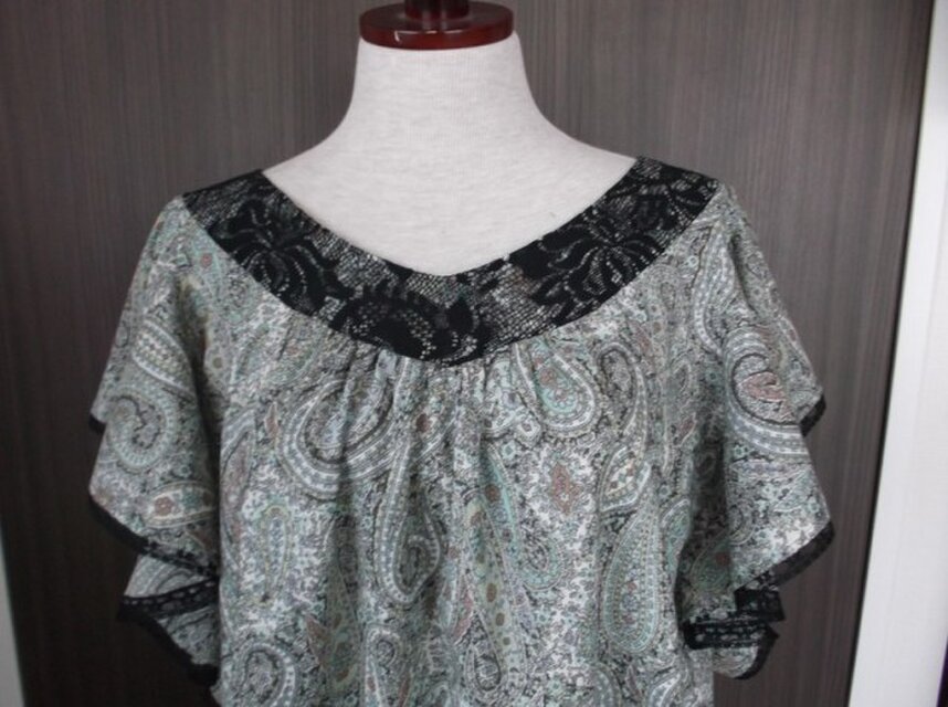 襟ぐりと脇、袖口と裾にぐるりとレースをあしらいました。