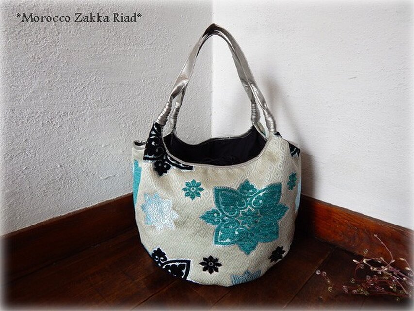 このバッグに使用されている布は、モロッコのサロン(居間)でソファやクッションに使用される布です。モロッコ産のゴブラン織りは凹凸がとっても素敵♪日本ではこのようなデザインのファブリックはお目にかかれません。モロッコならではの感性デス。 バッグとの形ととても相性よく仕上がっています。
