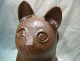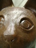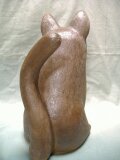 手びねりで、頭、胴、腕、尻尾、足が空洞な、目、鼻、毛にもこだわりをもって作りました。益子陶土の赤土と並土をブレンドした土を使い灰釉掛けして1240度で焼き上げ、薪の煙で燻して、こげ茶色に仕上げています。