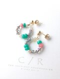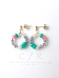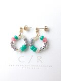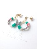 鮮やかなグリーンジェード、ホワイト淡水パール、スクエアー型のローズクオーツ、ガラスビーズ達をゴールドのパーツで組み合わせたサークルピアス。