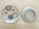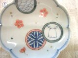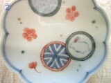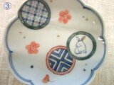 丸の中に小紋やうさぎを描き、合間に梅の花を散らした花型の小皿です。