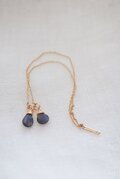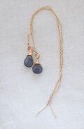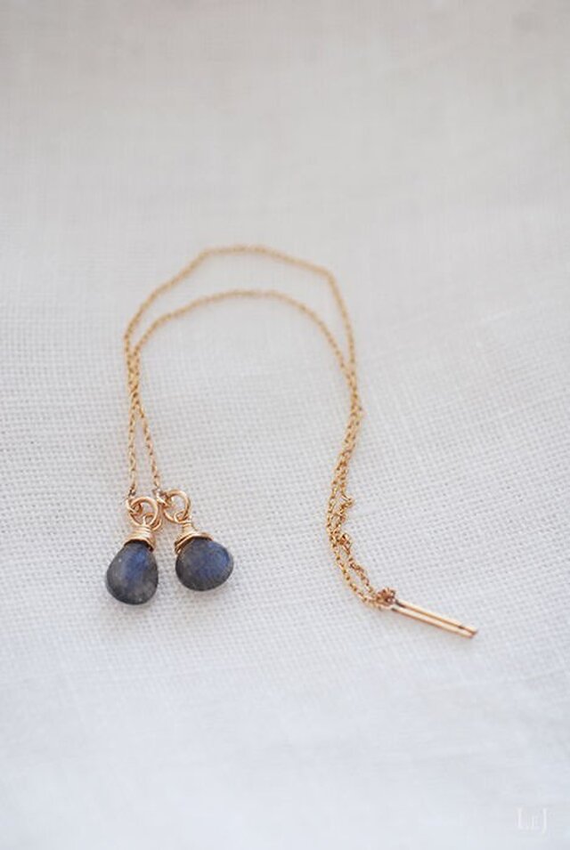 くっきりとしたブルーのシラー、ころんとしたカットが美しいラブラドライトのチェーンピアス。ワイヤーで表情をつけました。こんなブルーはインディゴに合わせたり、シンプルな白いシャツに合わせたり、ブラックのタートルにも映えそうです。ラブラドライトは縦8mm、厚さ3mm。端から端までの長さ12,8cm。金属パーツは14Kゴールドフィルド。大人の女性にぴったりのピアスです。