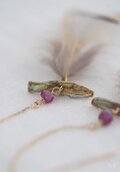 ふわふわと軽いフェザーに、スティックシェイプのパールと、ラズベリーのようなルビーを付けたチェーンピアス。濃厚なルビーが女性らしさを感じさせます。リネンやコットン、インディゴブルーにベストマッチ。ルビーは⌀5mm×4mm。フェザーは約6cm、ふわっと内側にカーブを描きます。パールは20mm。ルビーから下の長さは80mm。全体の長さは16cm。チェーンピアスパーツは14Kゴールドフィルド。シンプルなウエアをぐっと引き立てるアクセサリーです。