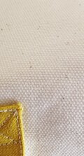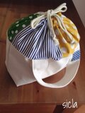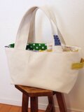 シンプルな生成りの帆布トートバッグに、カラフルな色使いの巾着を付けてみました。