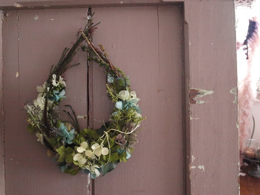 そんなイメージでグリーン×グリーンのしずく型リースをつくりました。