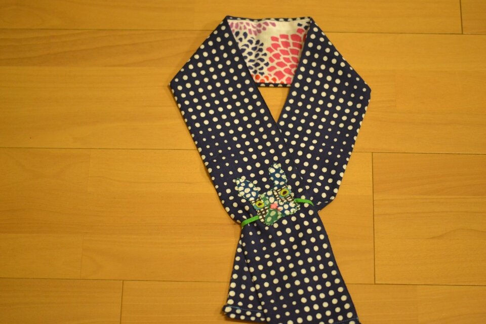 既成の手ぬぐいをスヌードに変身させました。
