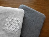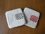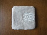織り目の細かいリネン生地に、伝統図案 「 花十字つなぎ 」 を刺したコースターです。