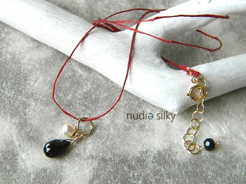 今回は、この幅0.5mm程の糸を、編み上げずに一本でネックレスに仕立てました。