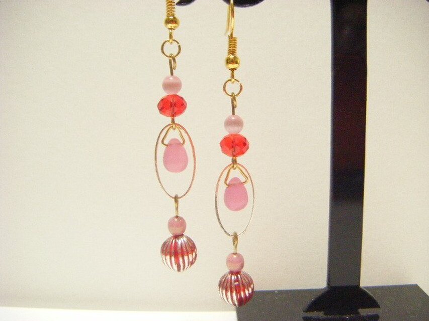 縦に長いシャープでスタイリッシュなデザインとなっておりますが、サークルフープの中で小さく揺れるオパールピンク色のしずく型チェコビーズがチャーミングでとても魅力的なピアスに仕上がりました♪