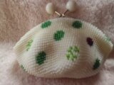 サイズは横約13センチ、縦約11.5センチ(がま口含む)です。色はパールホワイトのビーズに緑のドットと四つ葉のクローバー4つ(片面に2つづつ)、てんとうむしが2匹(片面に1匹づつ)柄です。