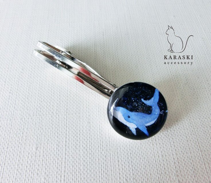 濃紺の背景にくじらを描いた絵を、樹脂で閉じ込めたネクタイピンです。