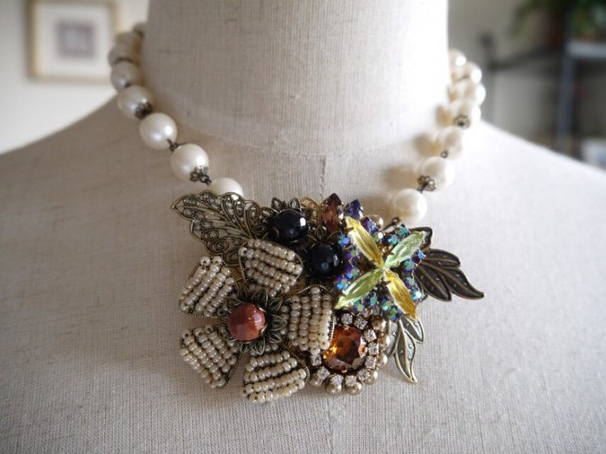 チェコ製のヴィンテージガラスボタン、スワロフスキーのガラスビーズ、