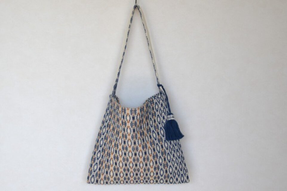 伝統的な柄を元に、オリジナルな要素を加え織ったポーチです。持ち手につけているタッセルはバッグに合わせて作っています。